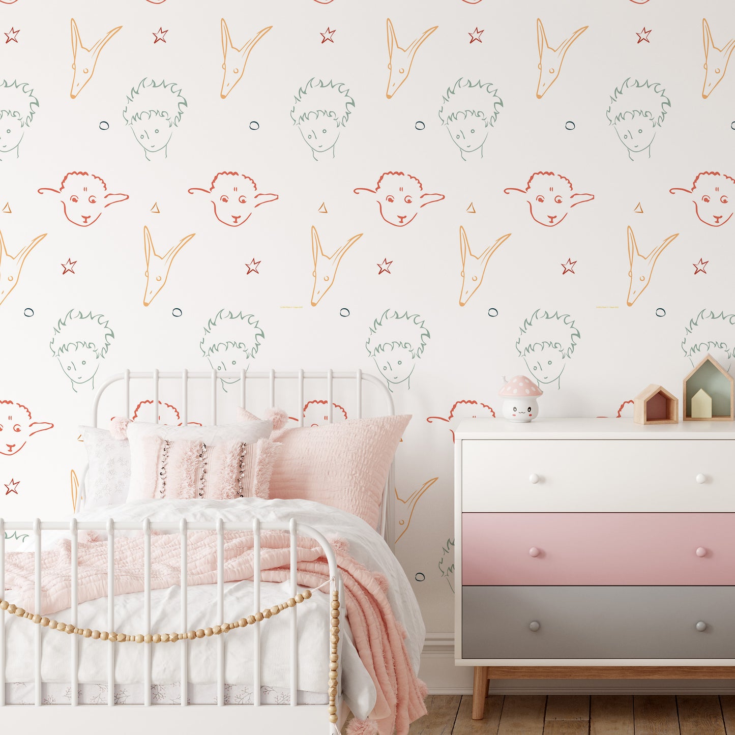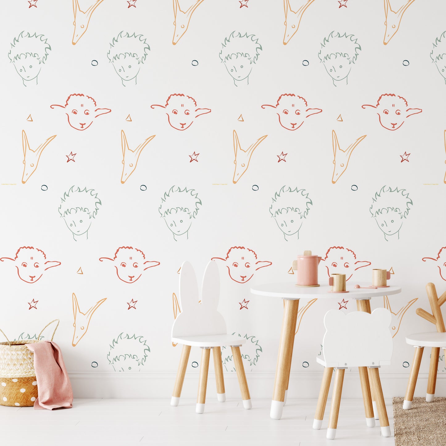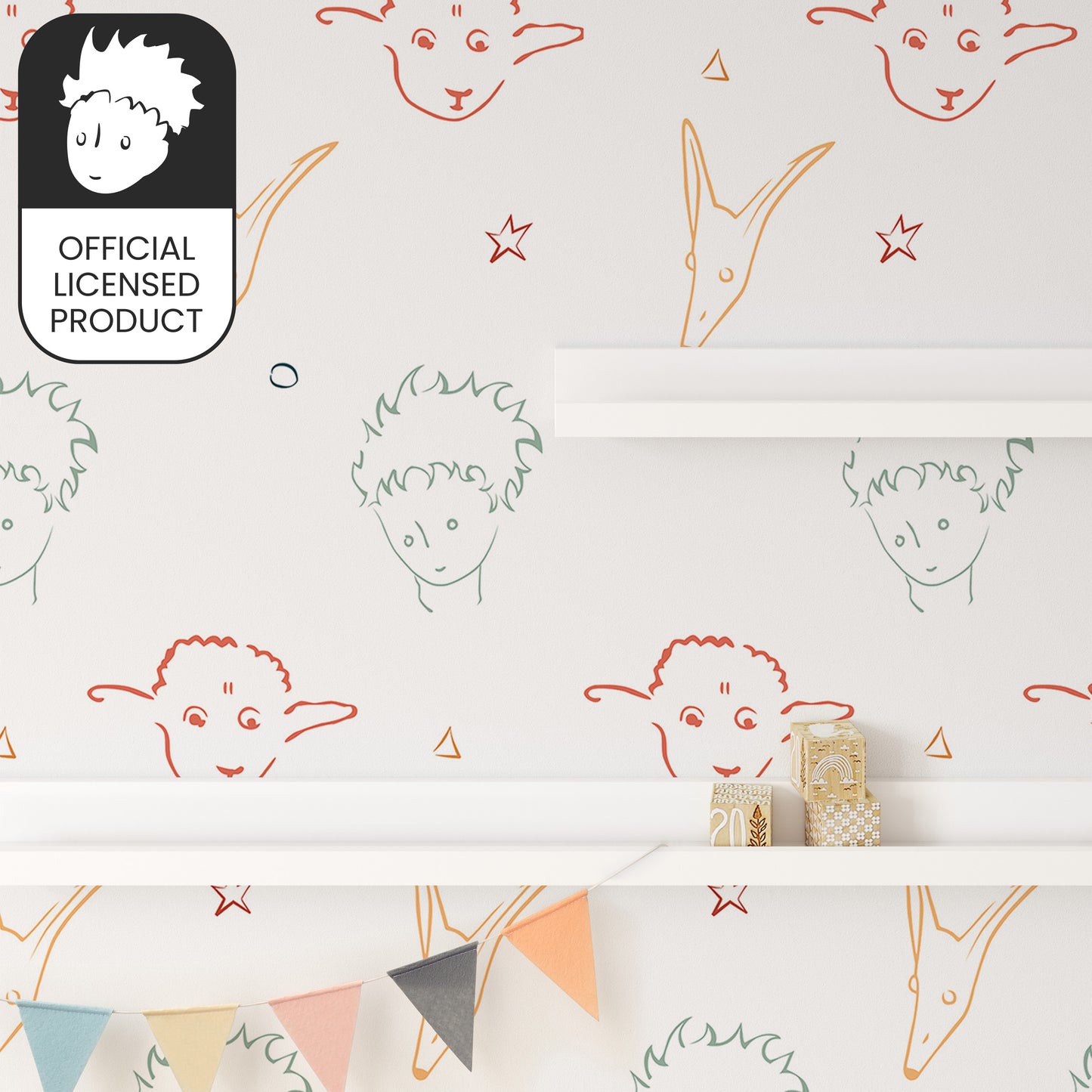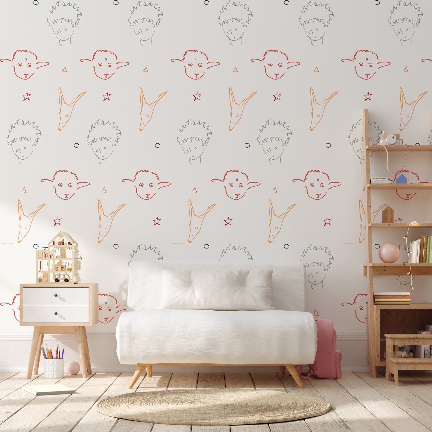 The pattern showcases the story's essential characters rendered in delicate, single-color line art: the Little Prince himself drawn in soft green lines with his characteristic curly hair and gentle expression; the famous lamb (the very first drawing he requests from the aviator) illustrated in warm red lines with its sweet face and innocent eyes; and the wise fox depicted in orange lines that capture its alert, intelligent nature. Small geometric elements - outlined red stars, orange triangles, and blue circles - provide subtle accents that reference the cosmic and geometric themes of the original story.