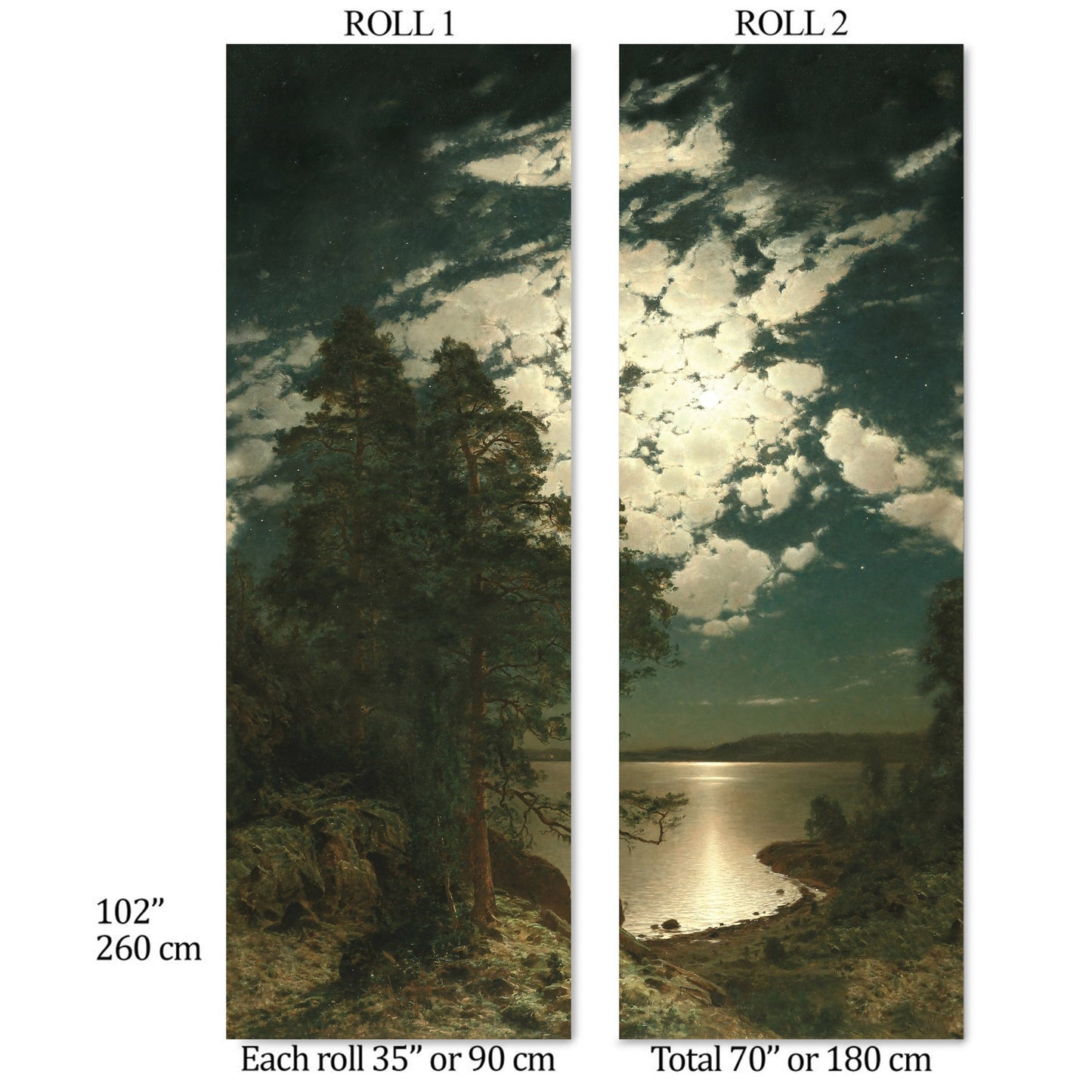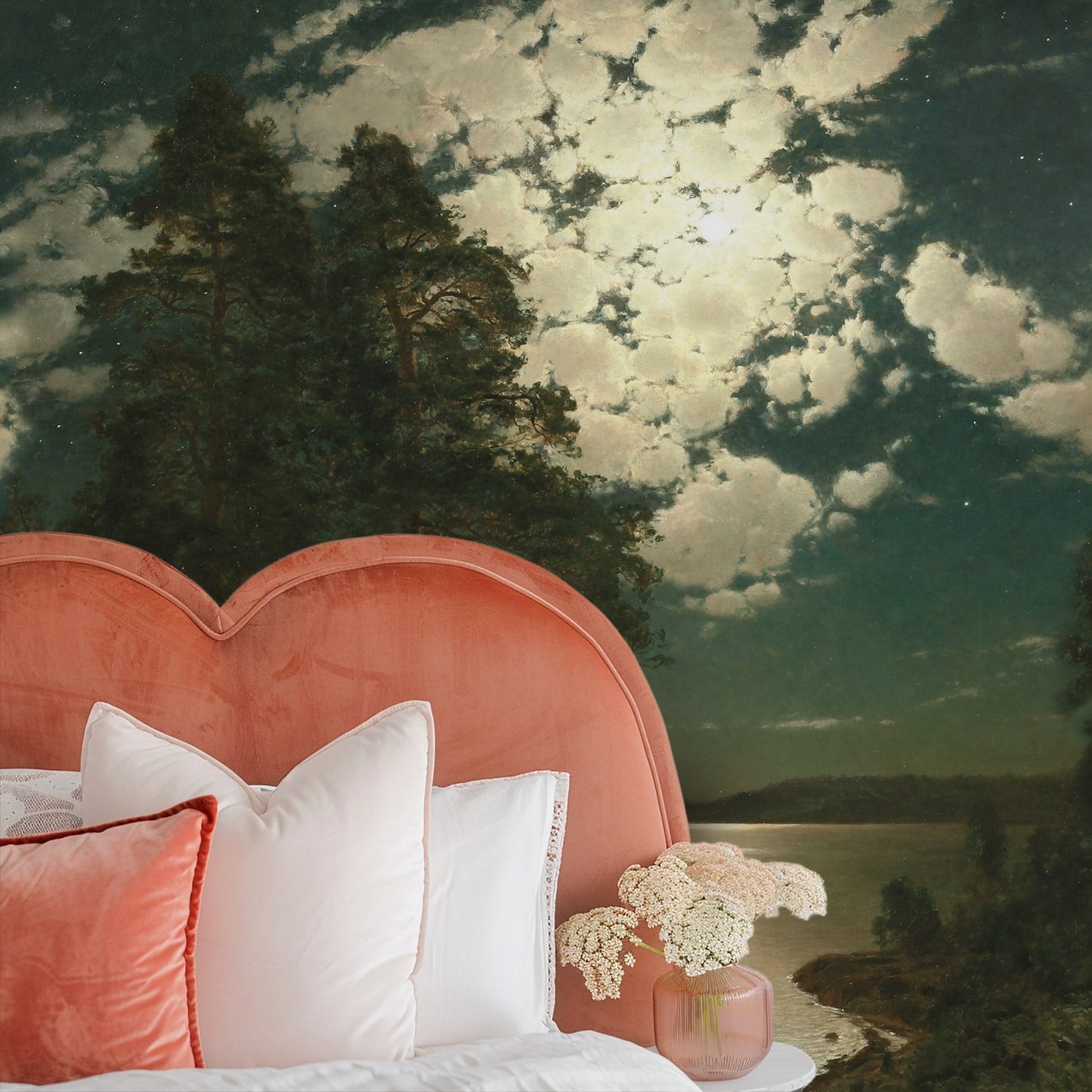 Discover the quiet power of nature in this moonlit forest mural wallpaper. Inspired by Nordic romanticism, this artwork captures a dramatic night sky and shimmering lake under the full moon. Printed on real paper, it's 100% vegan, plastic-free and ideal for bedrooms, studios, or serene interiors.