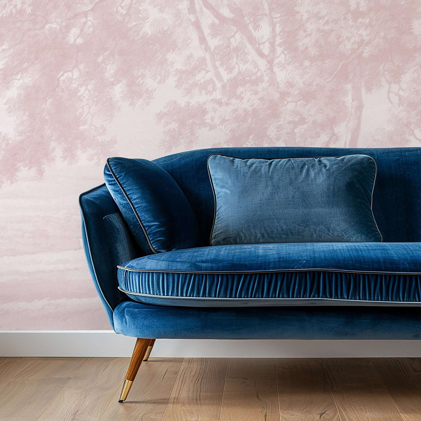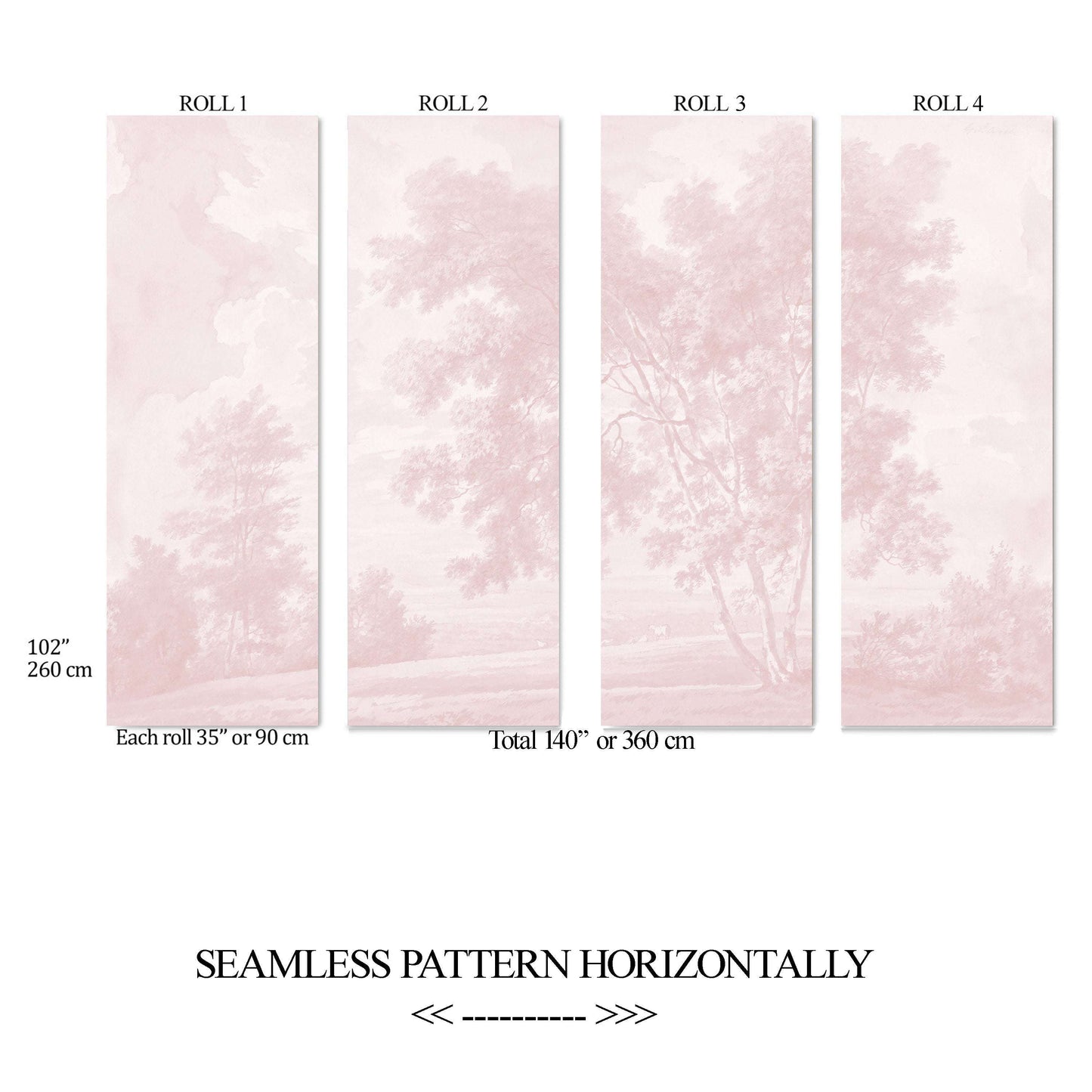 Step into a dreamlike world with this elegant blush pink wallpaper featuring soft, hand-painted trees and a vintage landscape scene.