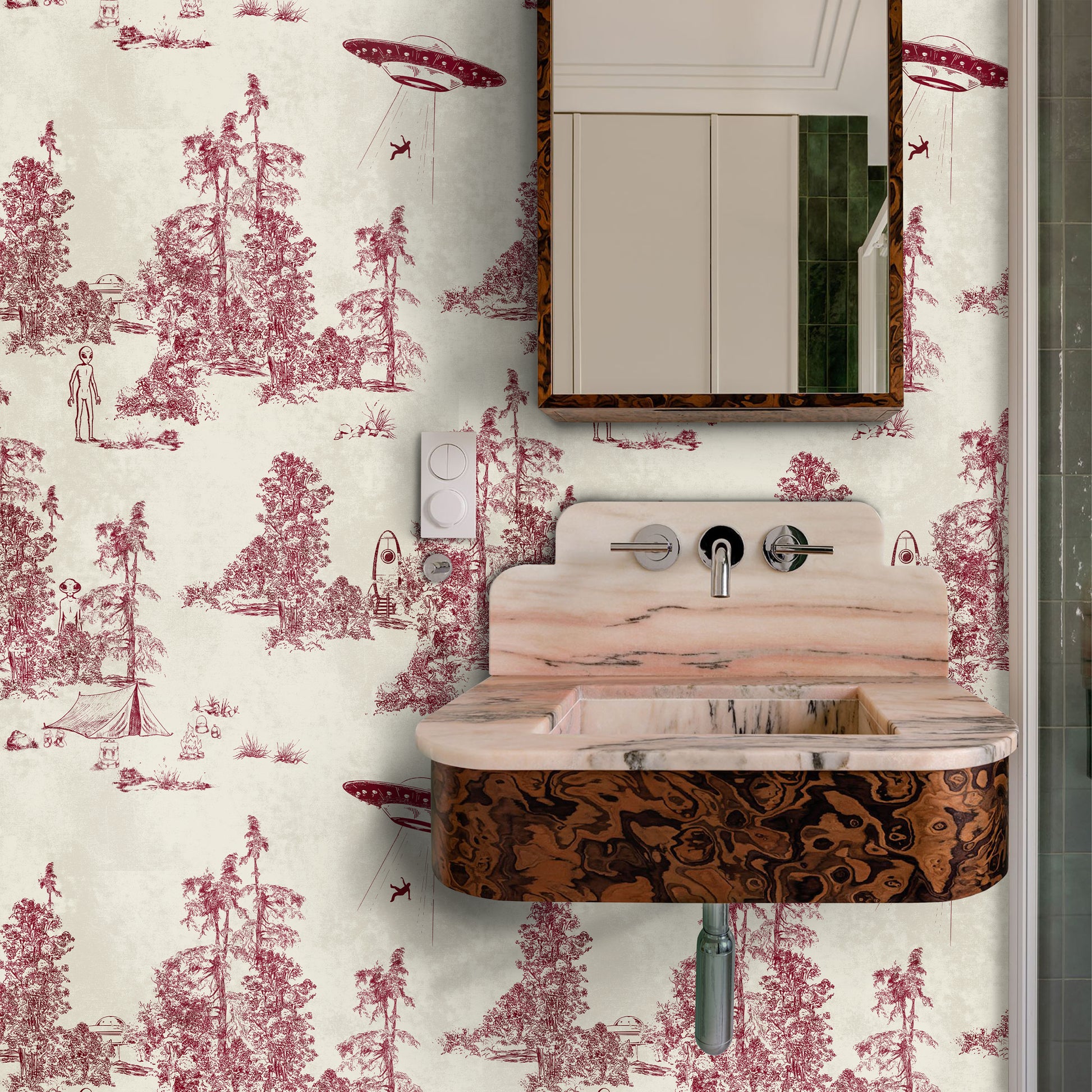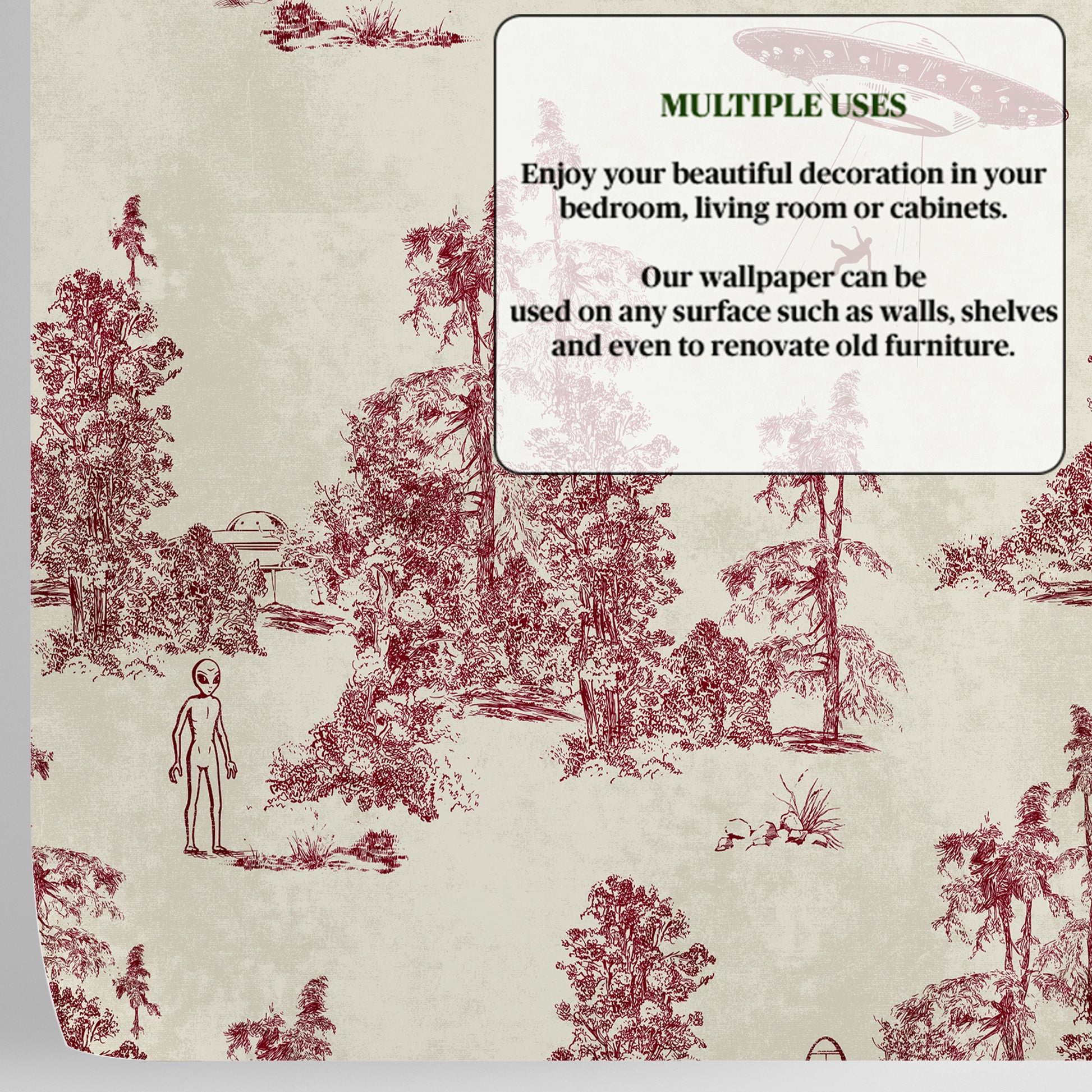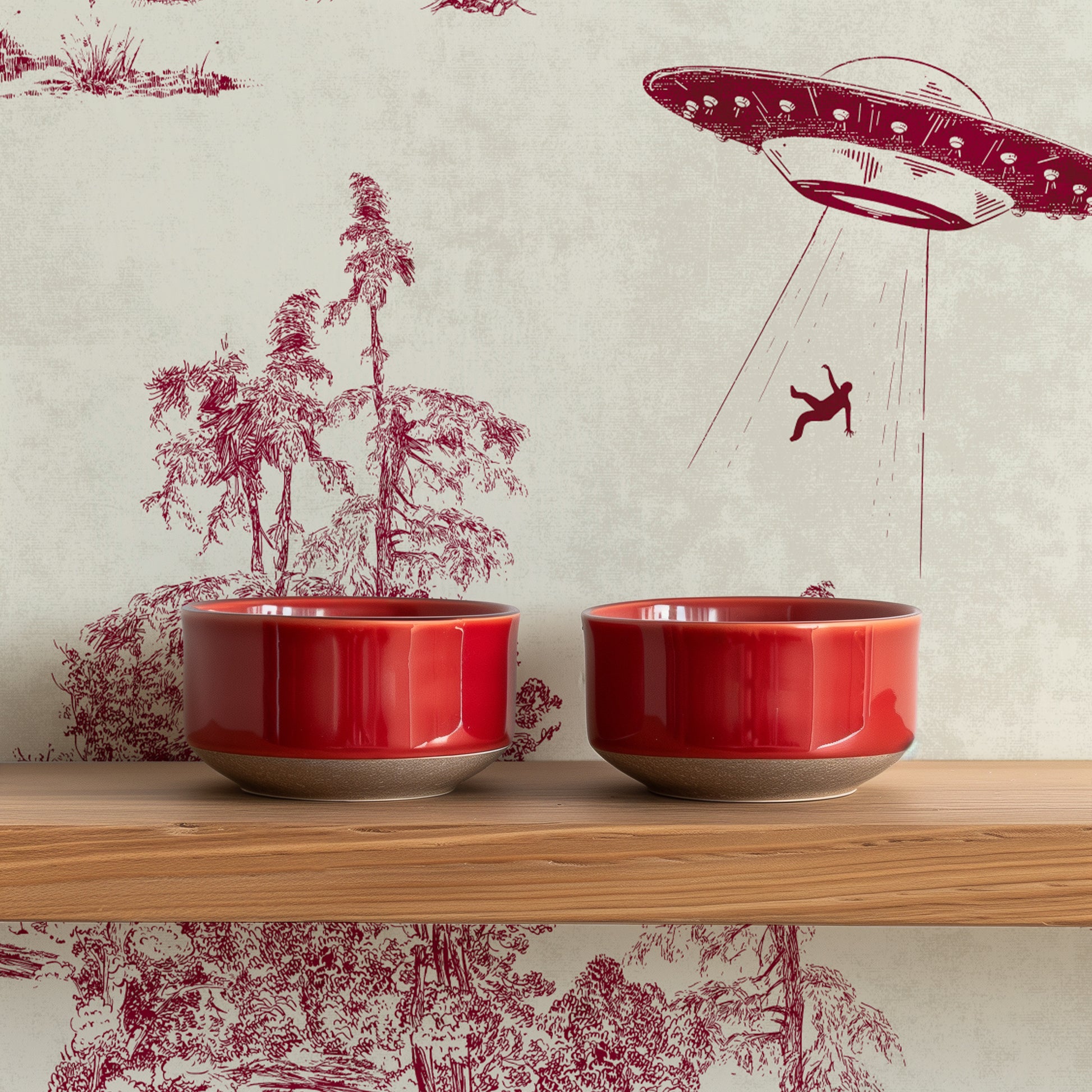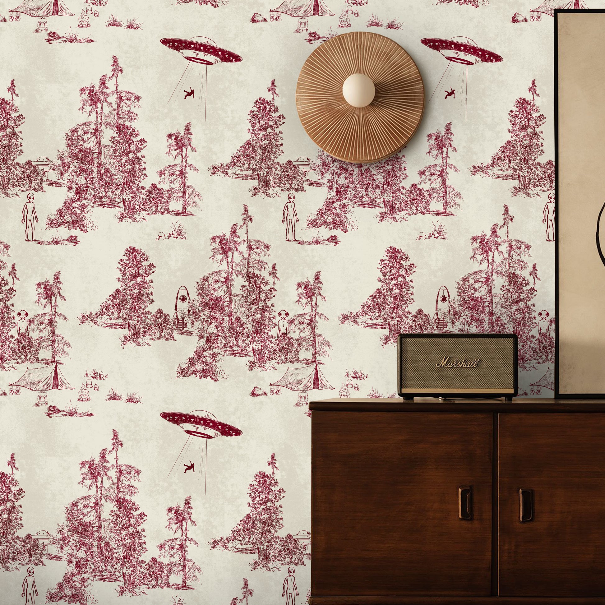 Rewrite the rules of classic décor with this subversive take on Toile de Jouy, where the traditional French pastoral is hijacked by extraterrestrial visitors. Printed in deep burgundy red on a softly textured cream background, the design keeps the elegance of the eighteenth-century technique and injects it with a wink of science fiction.