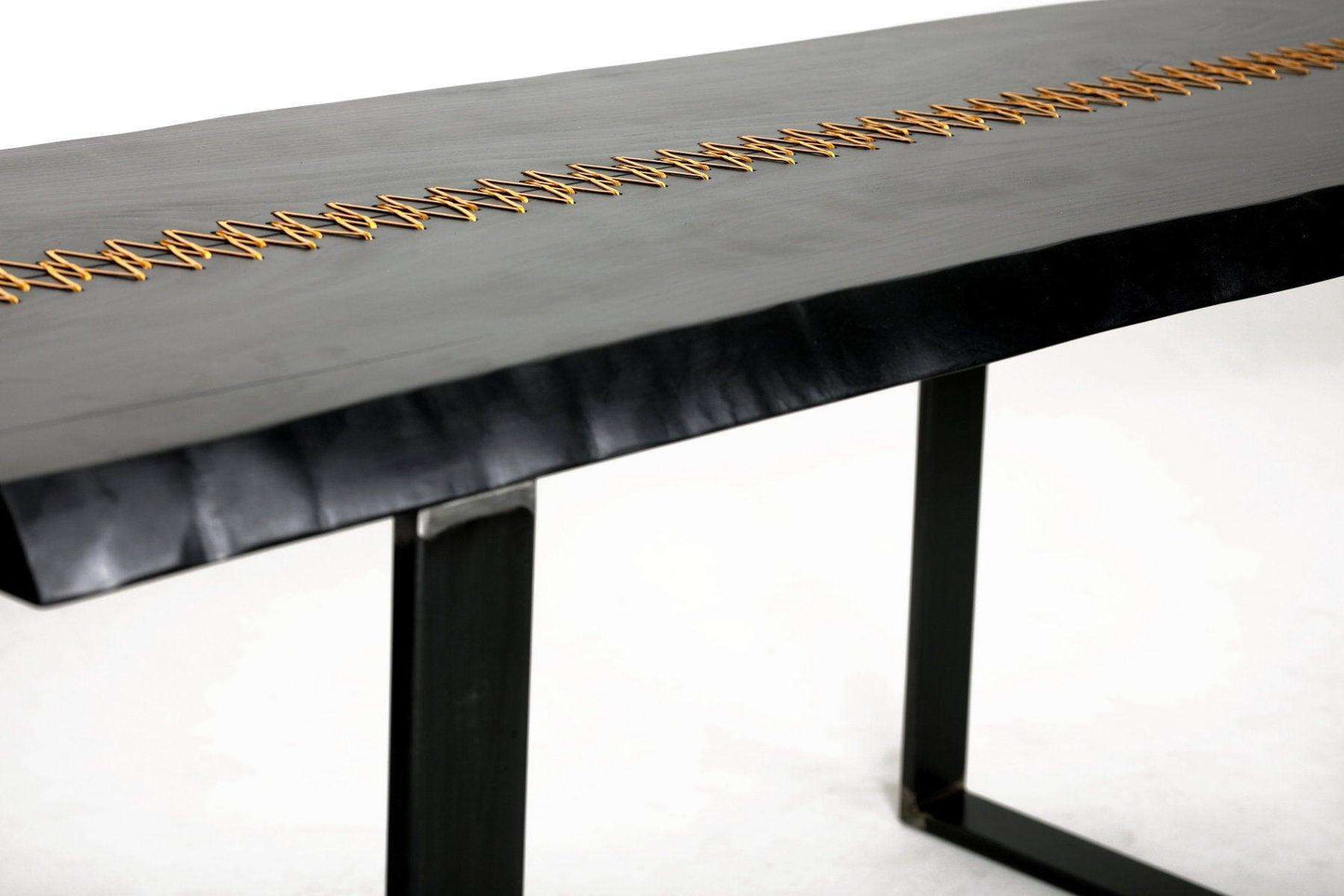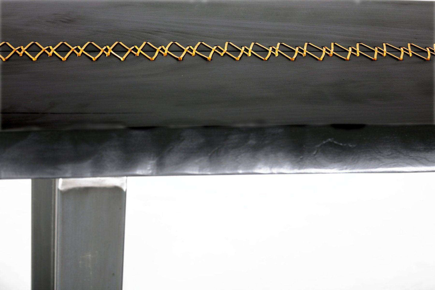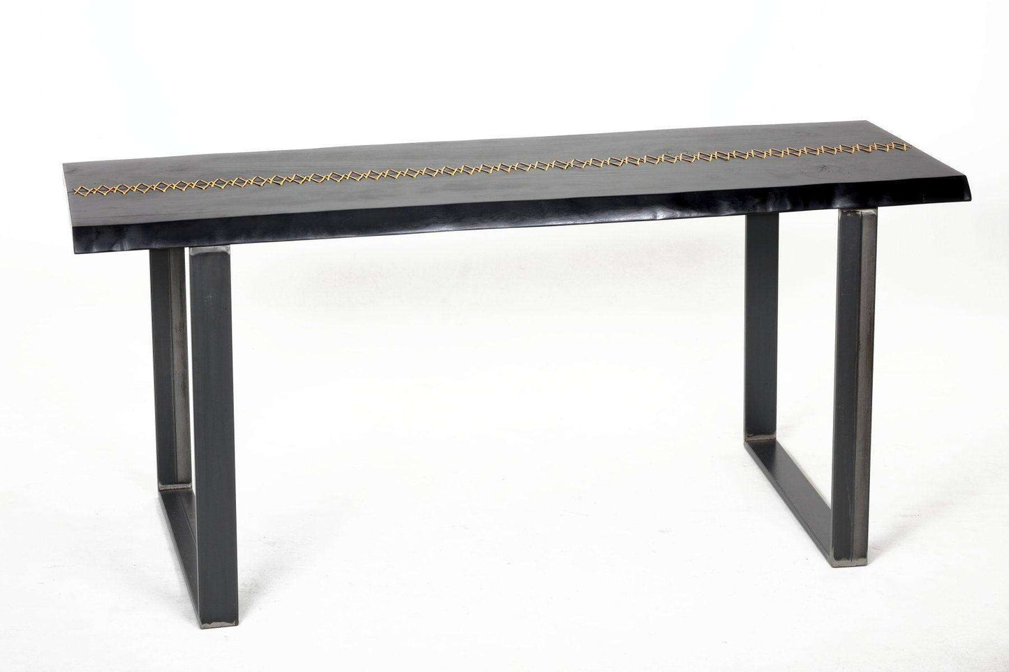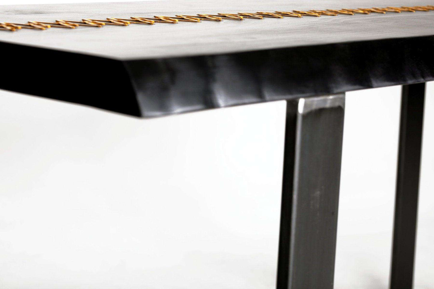 Mesa con sobre de madera maciza con listones pespunteados dorados y cantos redondeados, emparejada con una base de líneas geométricas y rigurosas que se expresa a través de potentes patas de hierro con acabado crudo y soldaduras a la vista.