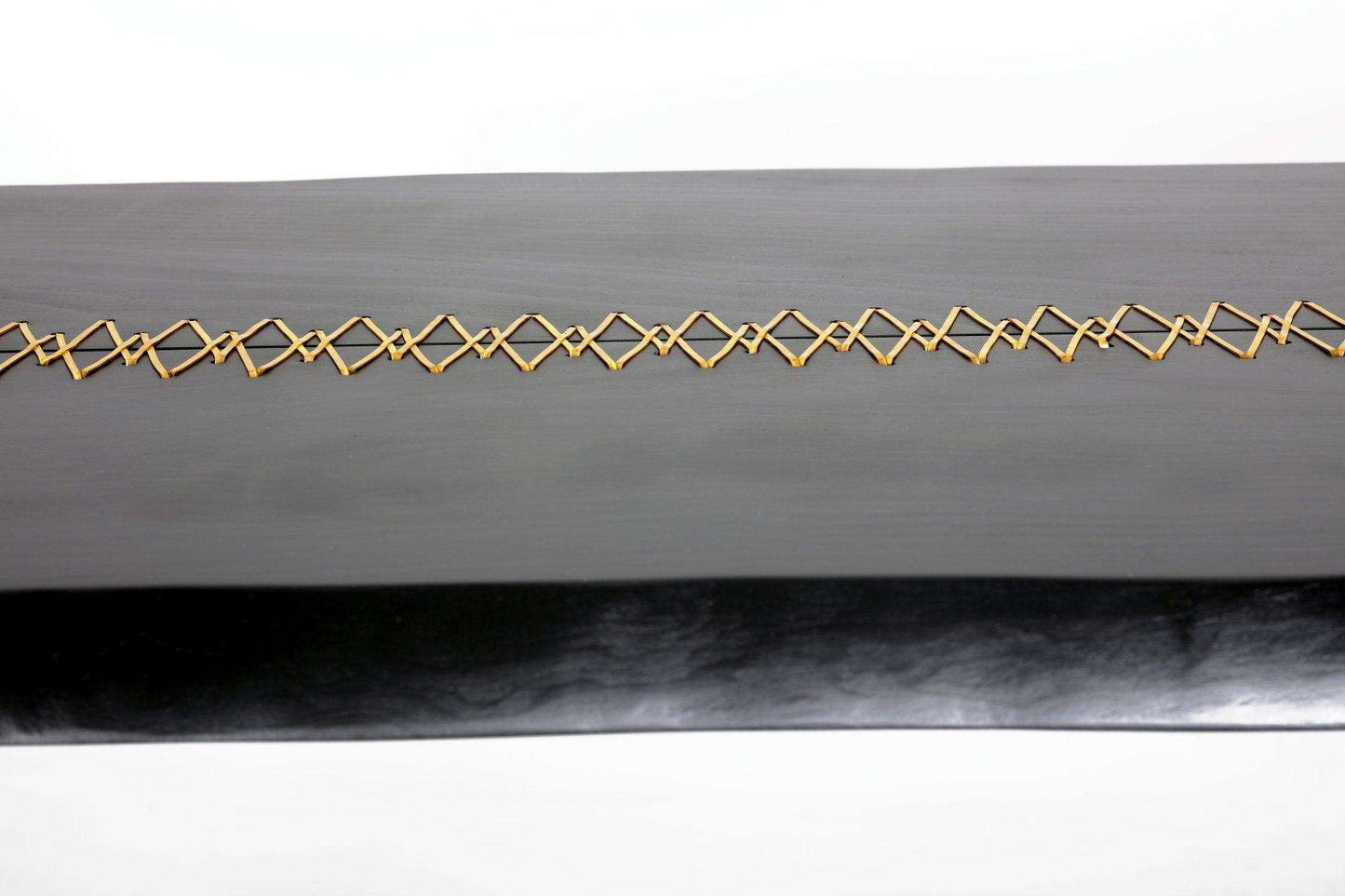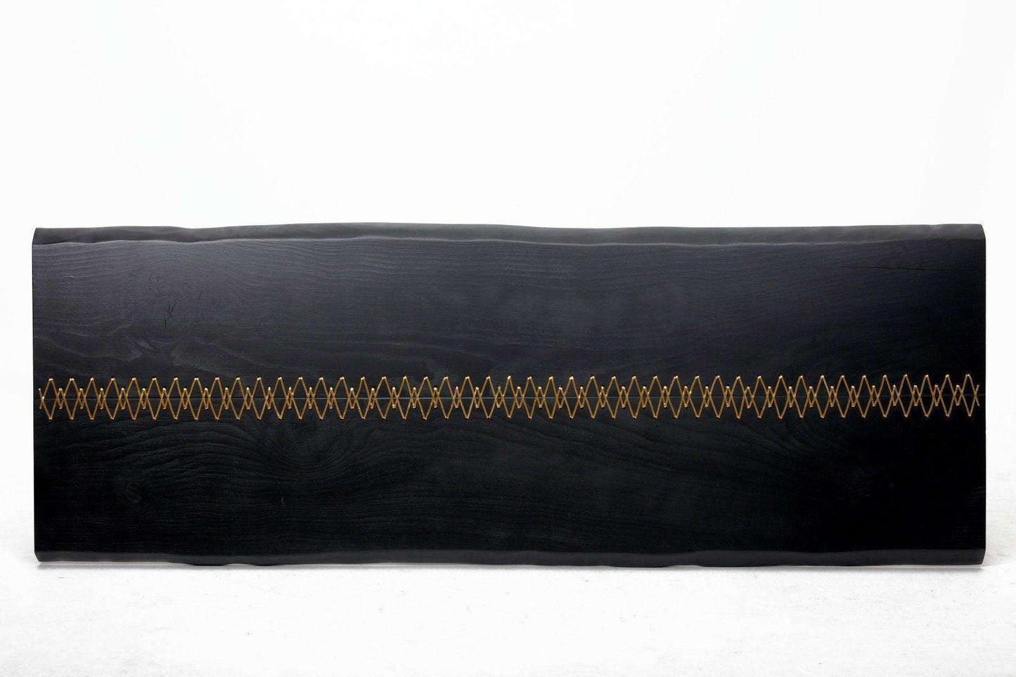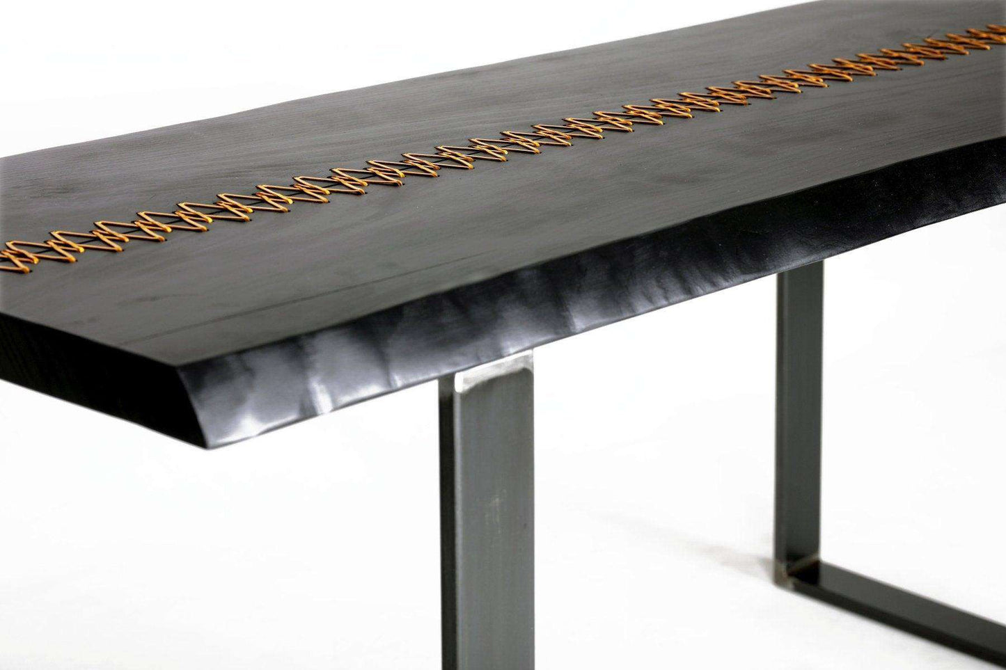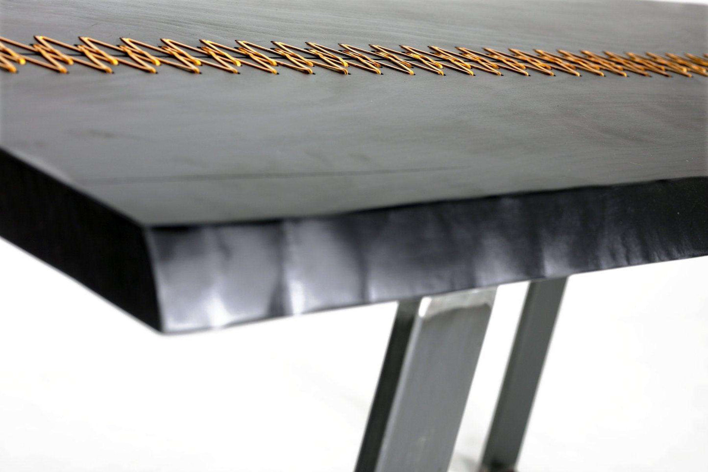 Mesa con sobre de madera maciza con listones pespunteados dorados y cantos redondeados, emparejada con una base de líneas geométricas y rigurosas que se expresa a través de potentes patas de hierro con acabado crudo y soldaduras a la vista.