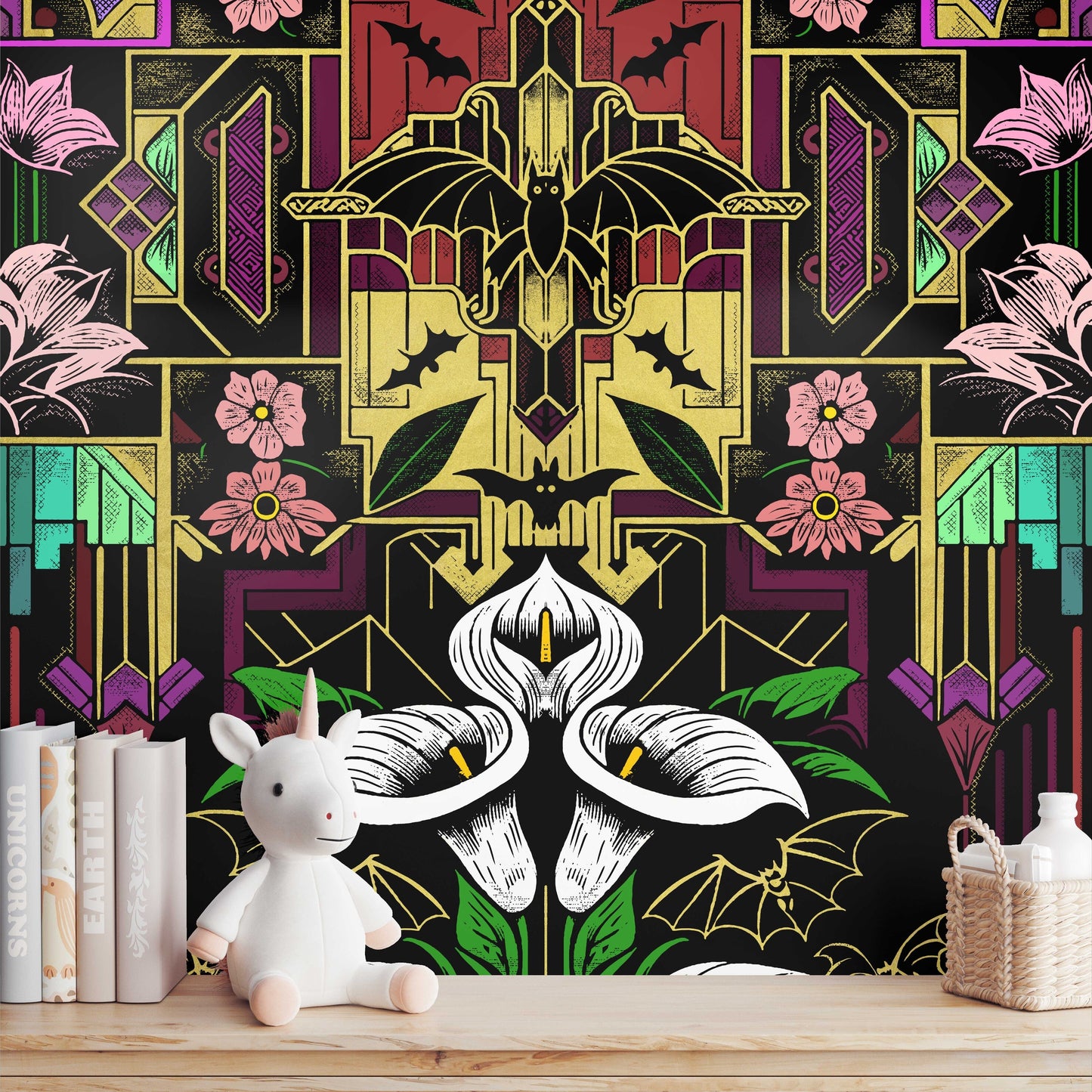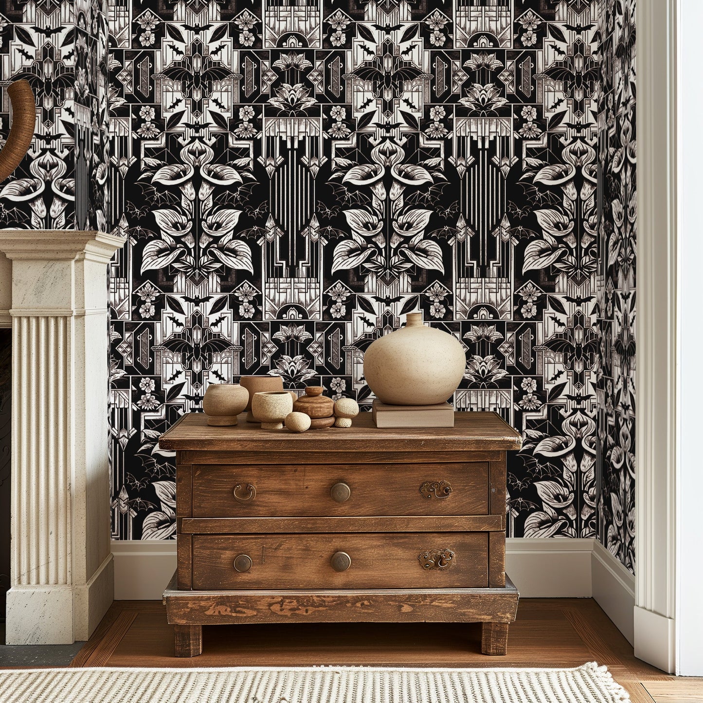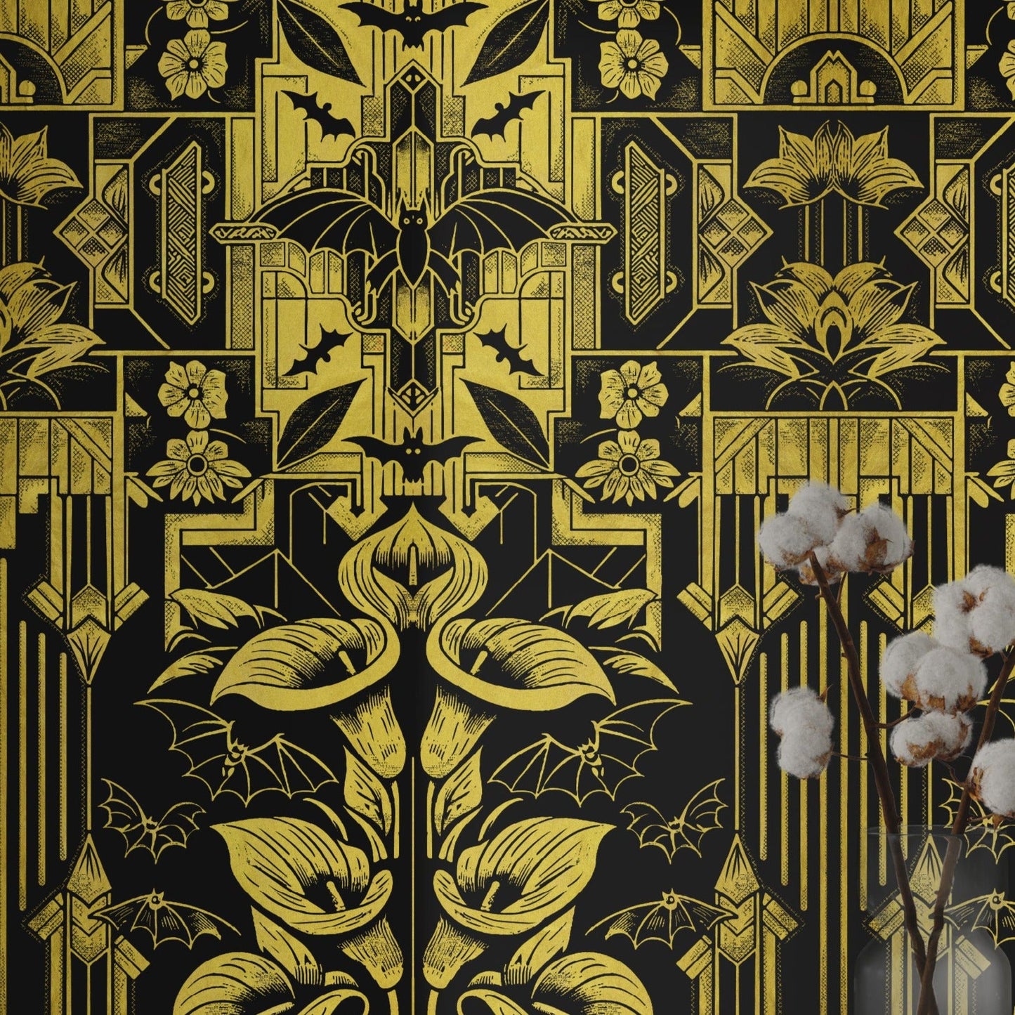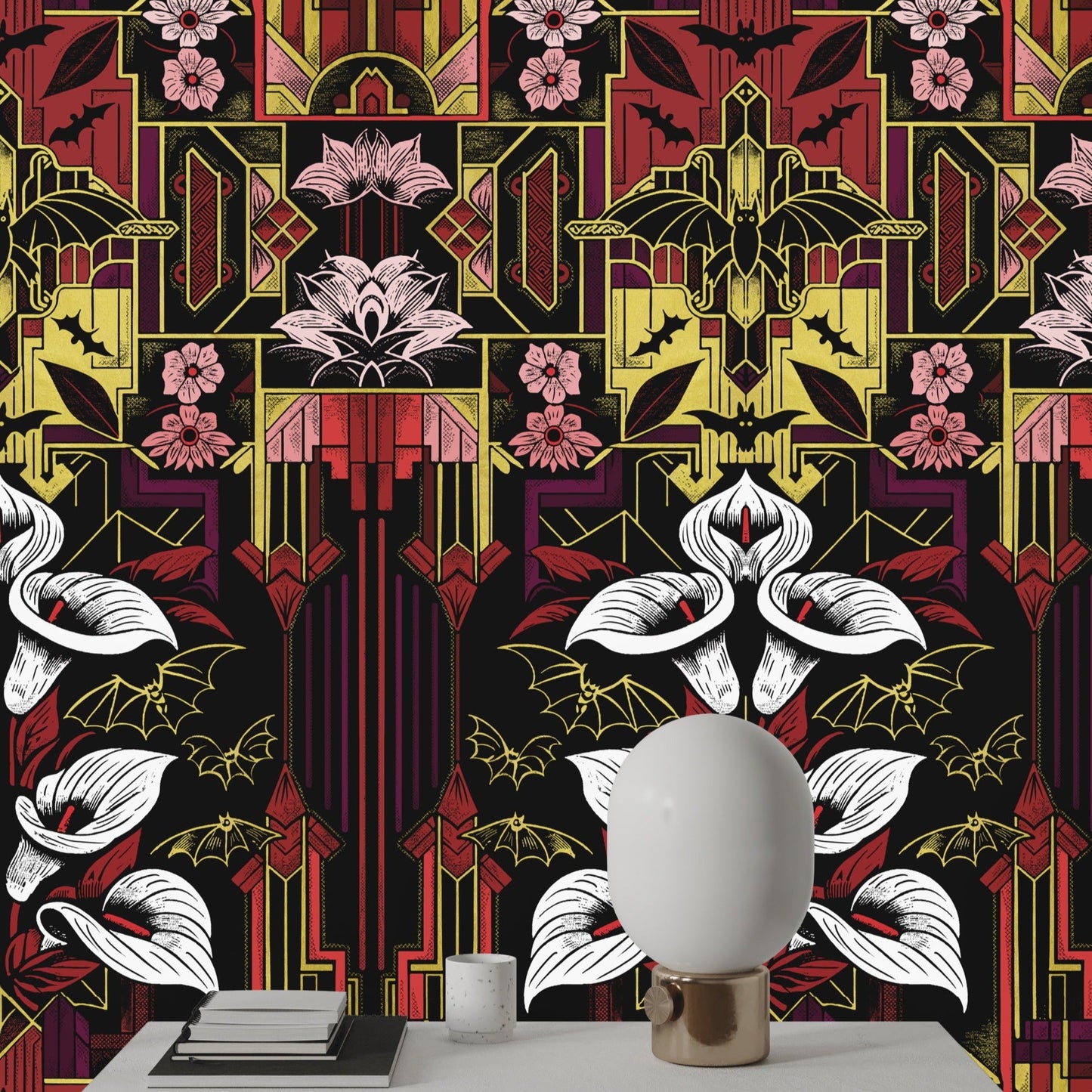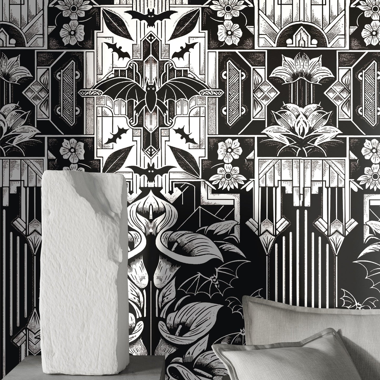 Art Deco Gothic Wallpaper - Bats and Floral Design