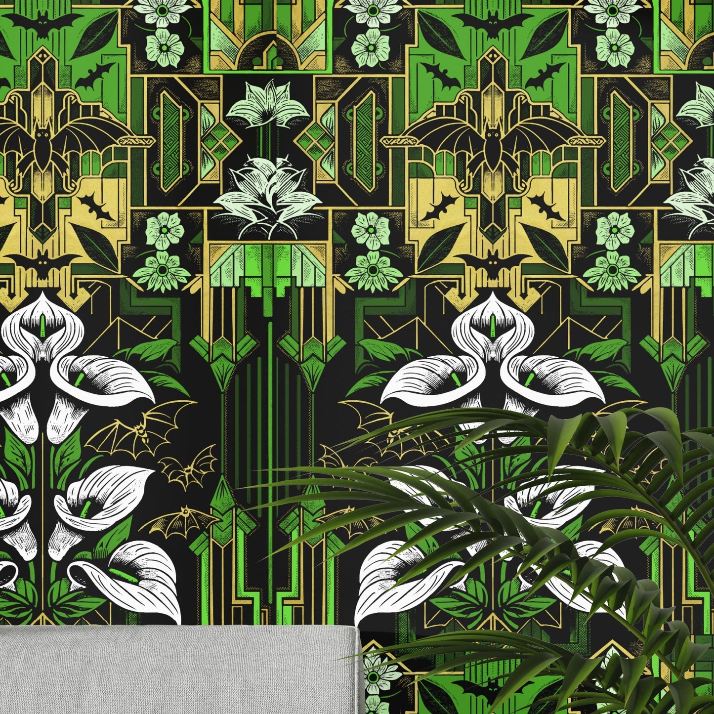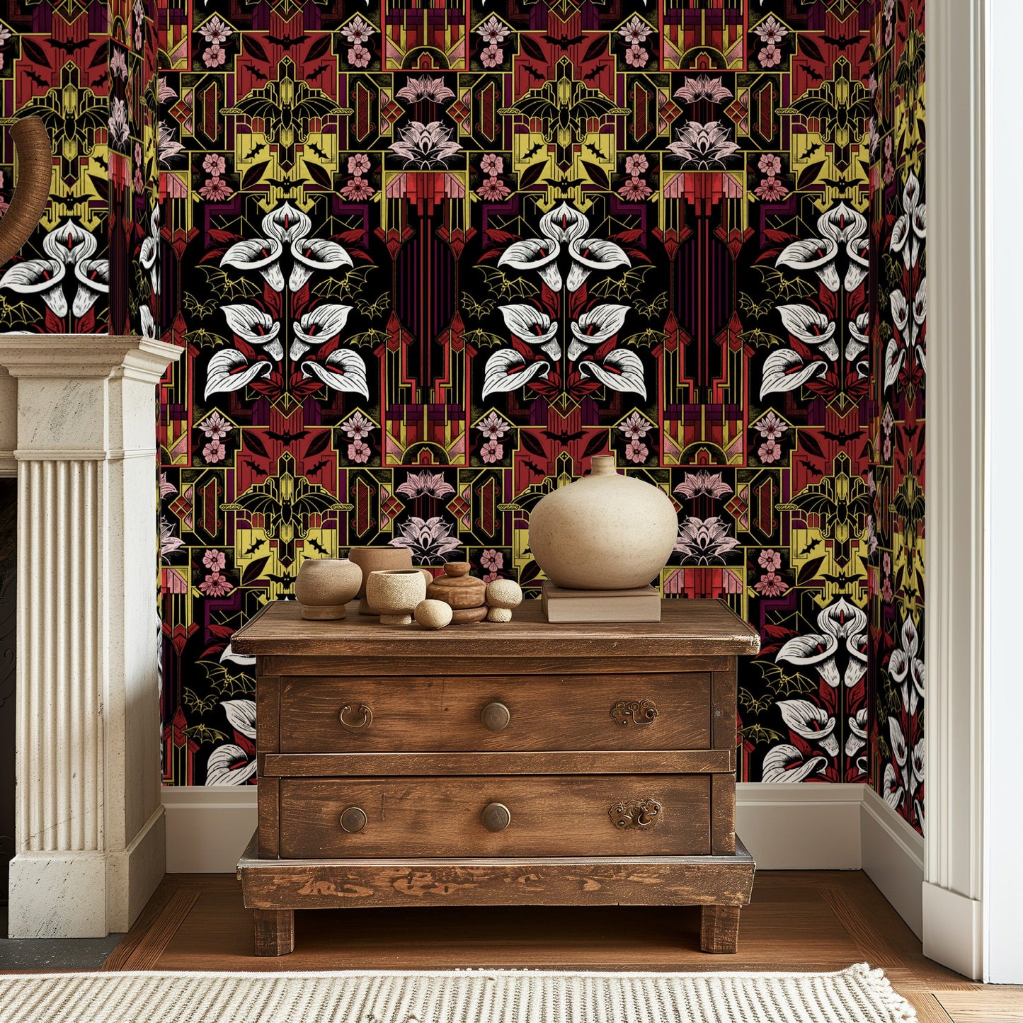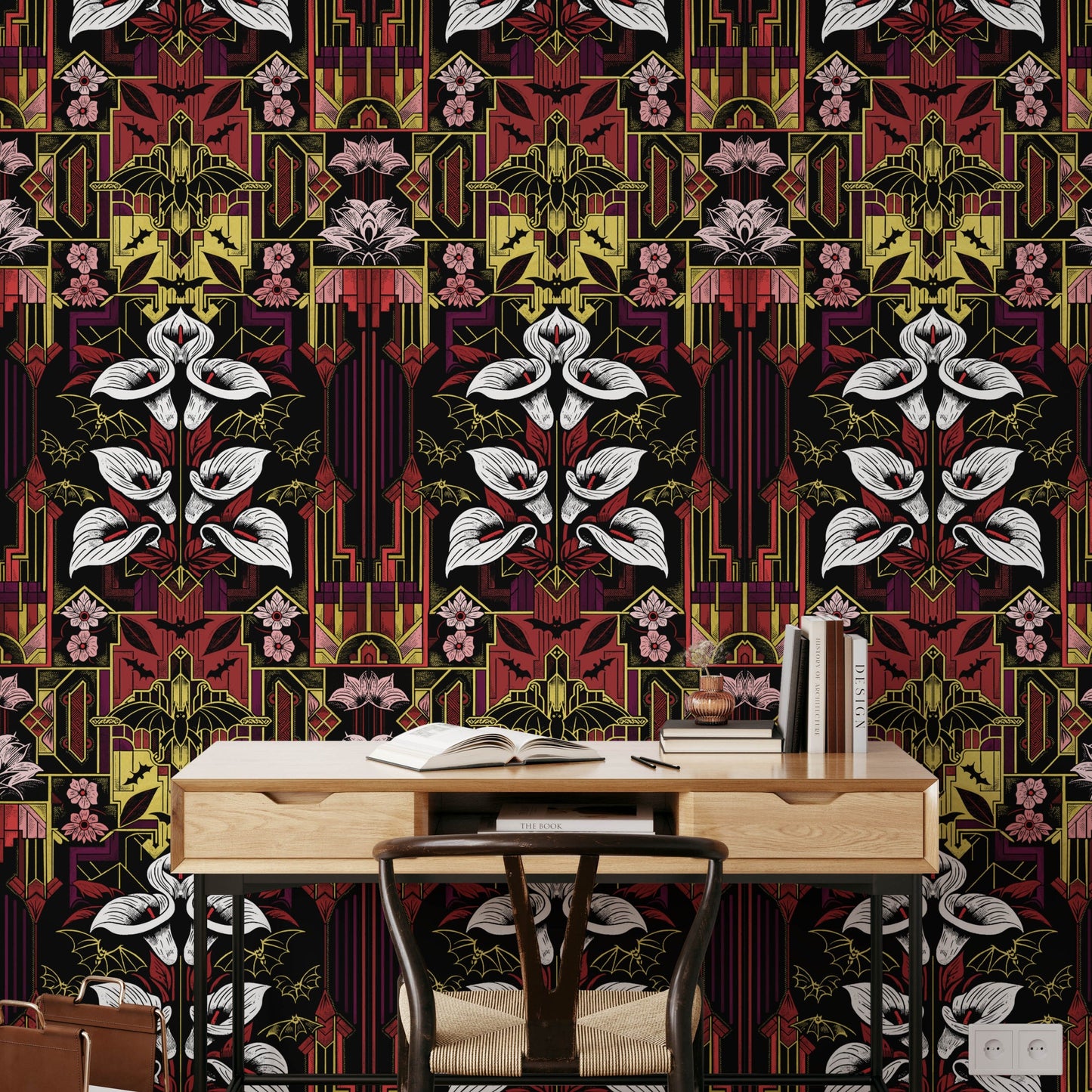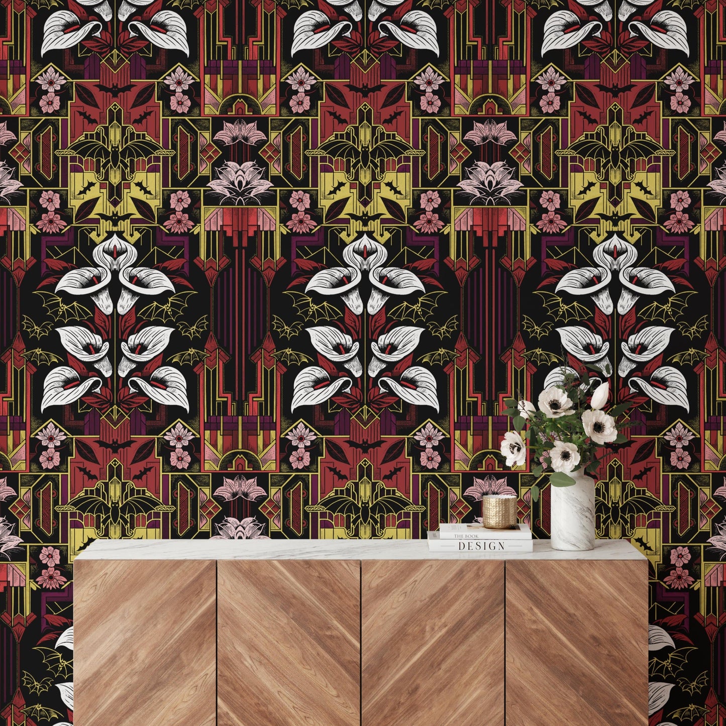Art Deco Gothic Wallpaper - Bats and Floral Design