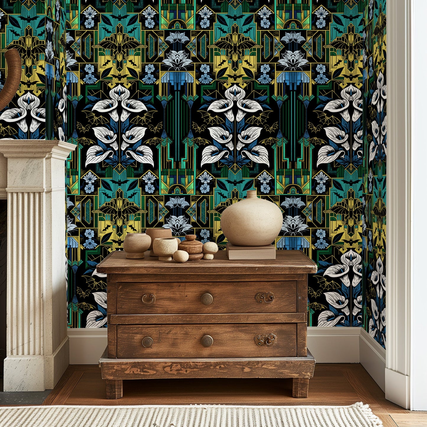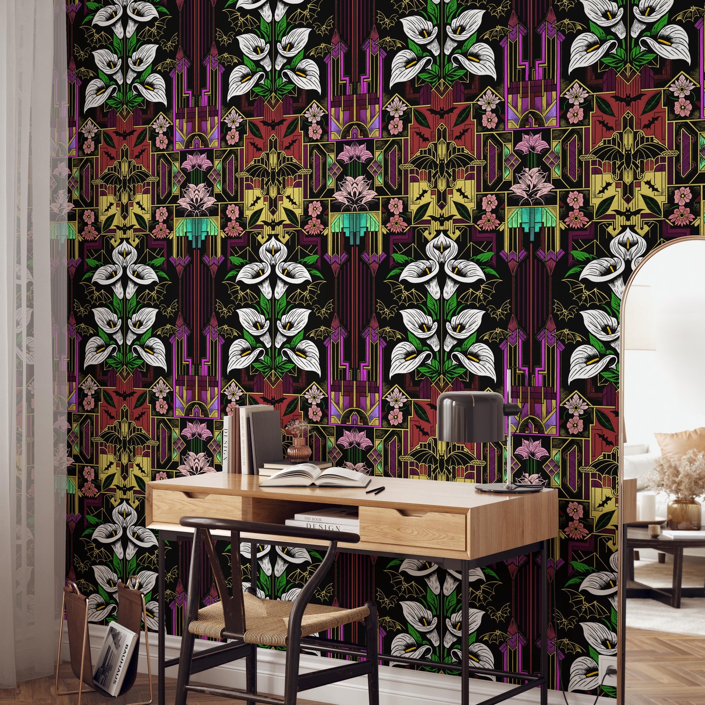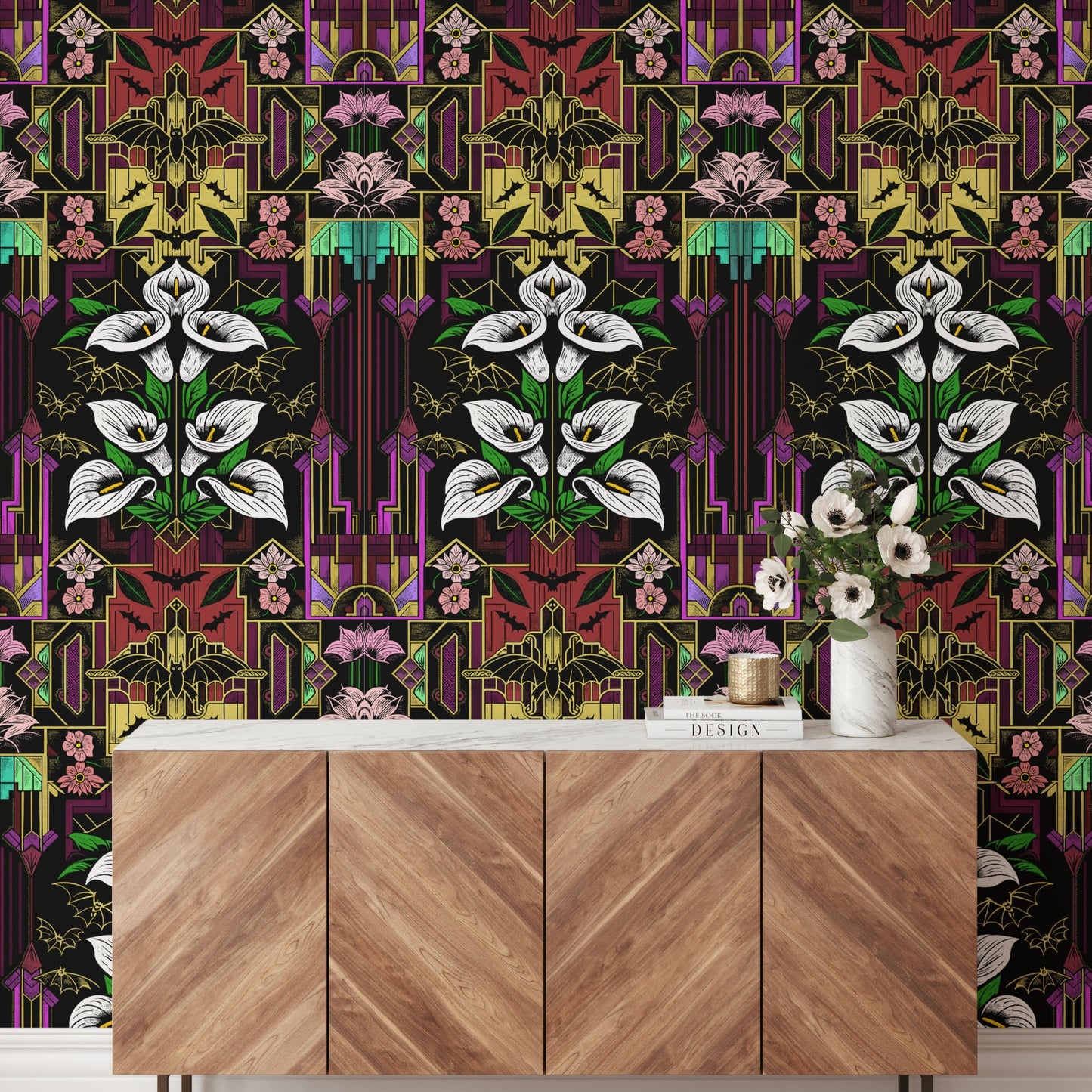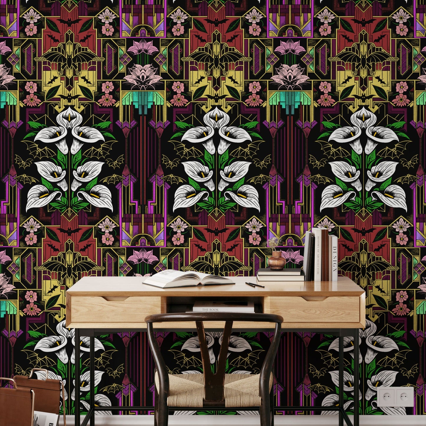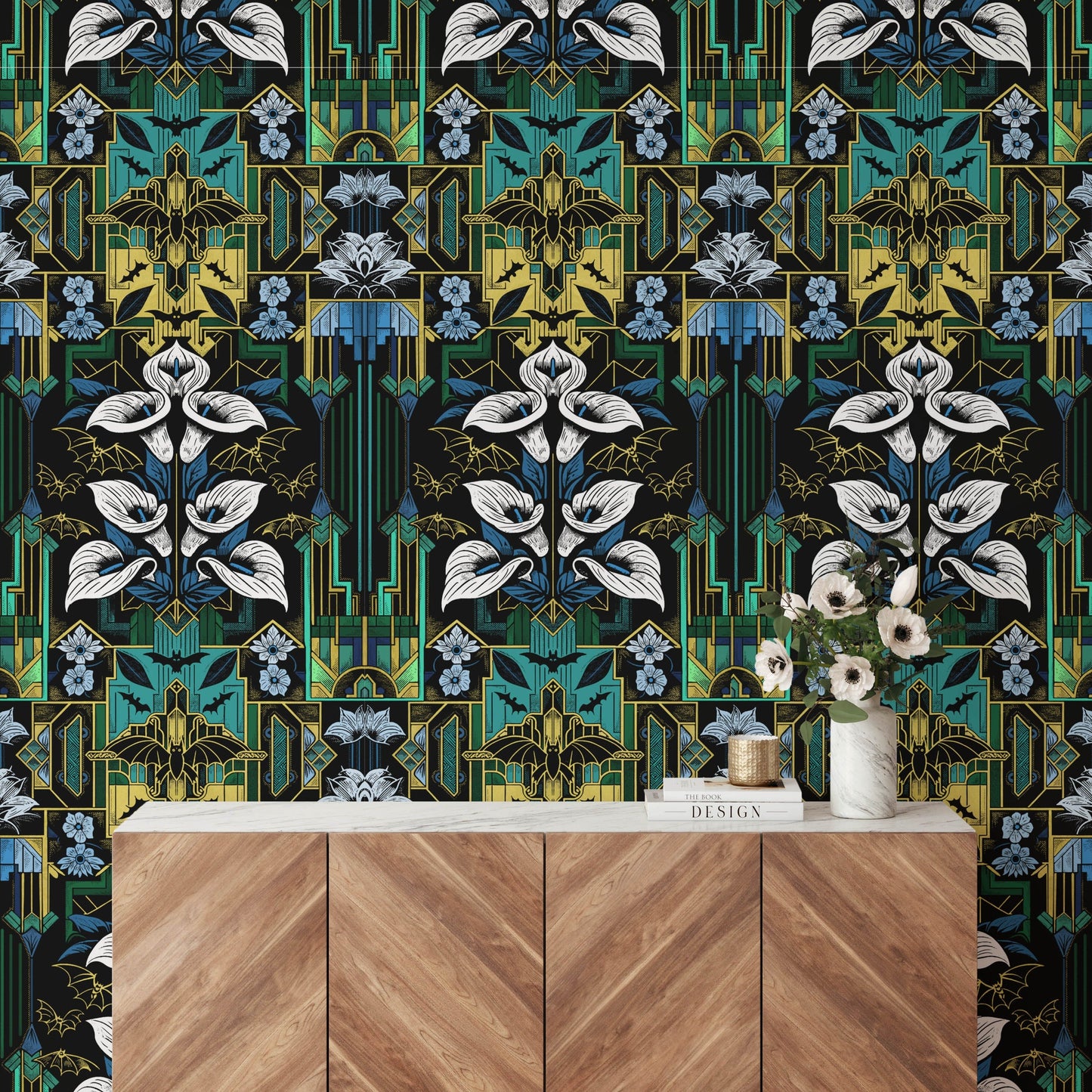 Art Deco Gothic Wallpaper - Bats and Floral Design
