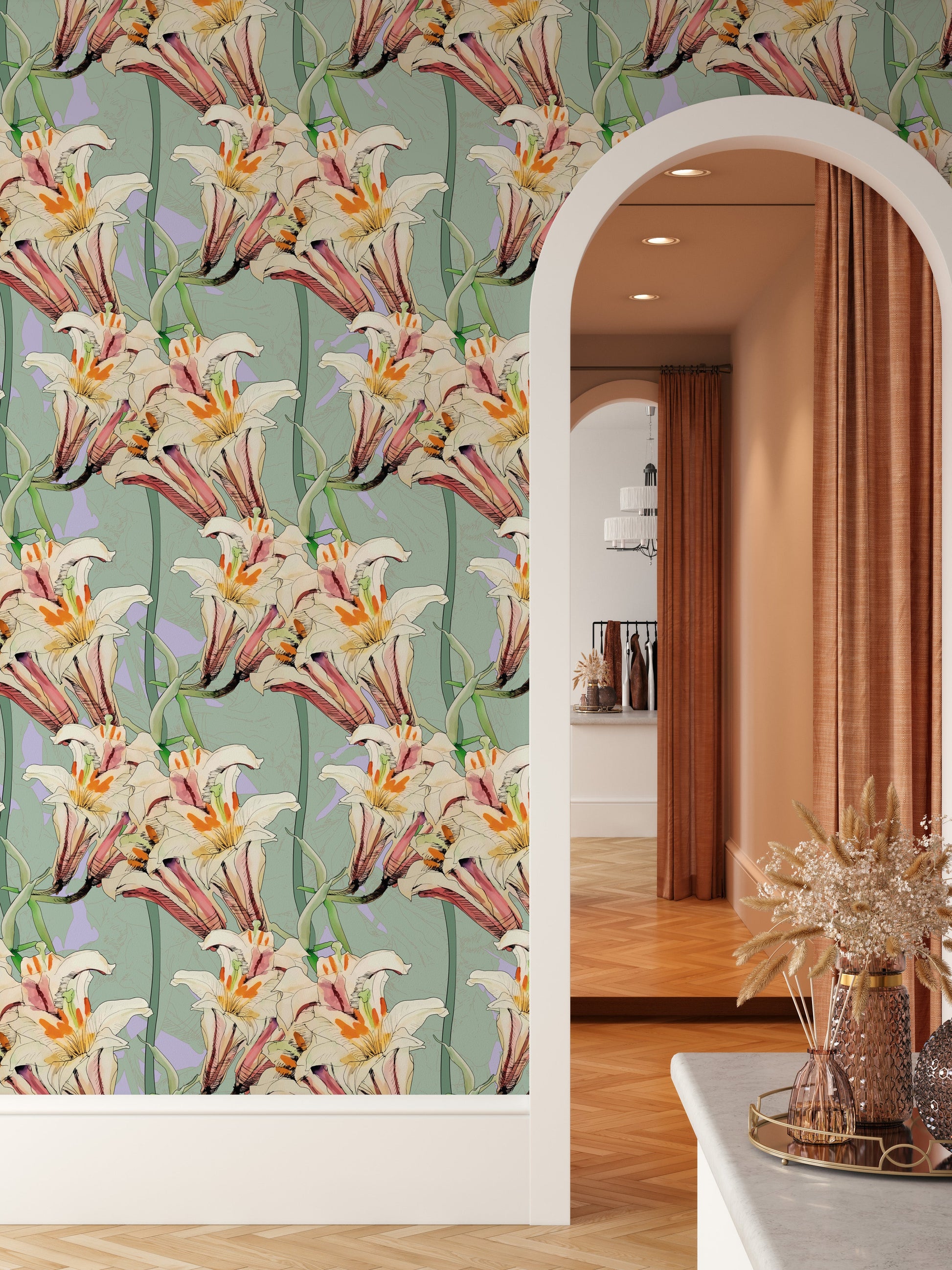 Embrace the elegance of the Art Nouveau era with our Pink Lily Floral Wallpaper. This exquisite wall art features watercolor lilies in soft pink hues, beautifully capturing the delicate grace of these flowers. Perfect for creating a serene and sophisticated atmosphere, this wallpaper showcases hanging lilies set against a gentle backdrop, adding a touch of timeless beauty to any room. The intricate details and fluid lines embody the essence of Art Nouveau's design, making it a stunning addition to your home decor. Transform your space with this enchanting wall mural, bringing the tranquility and charm of blooming lilies into your living environment.