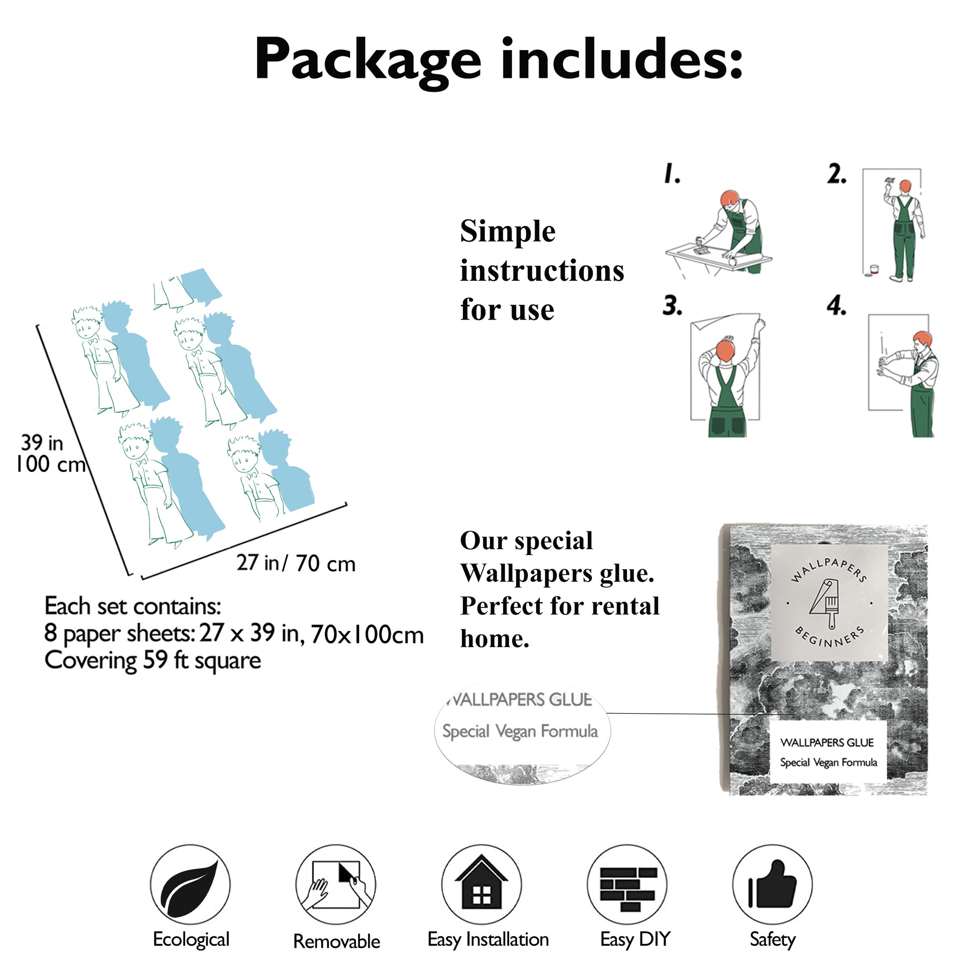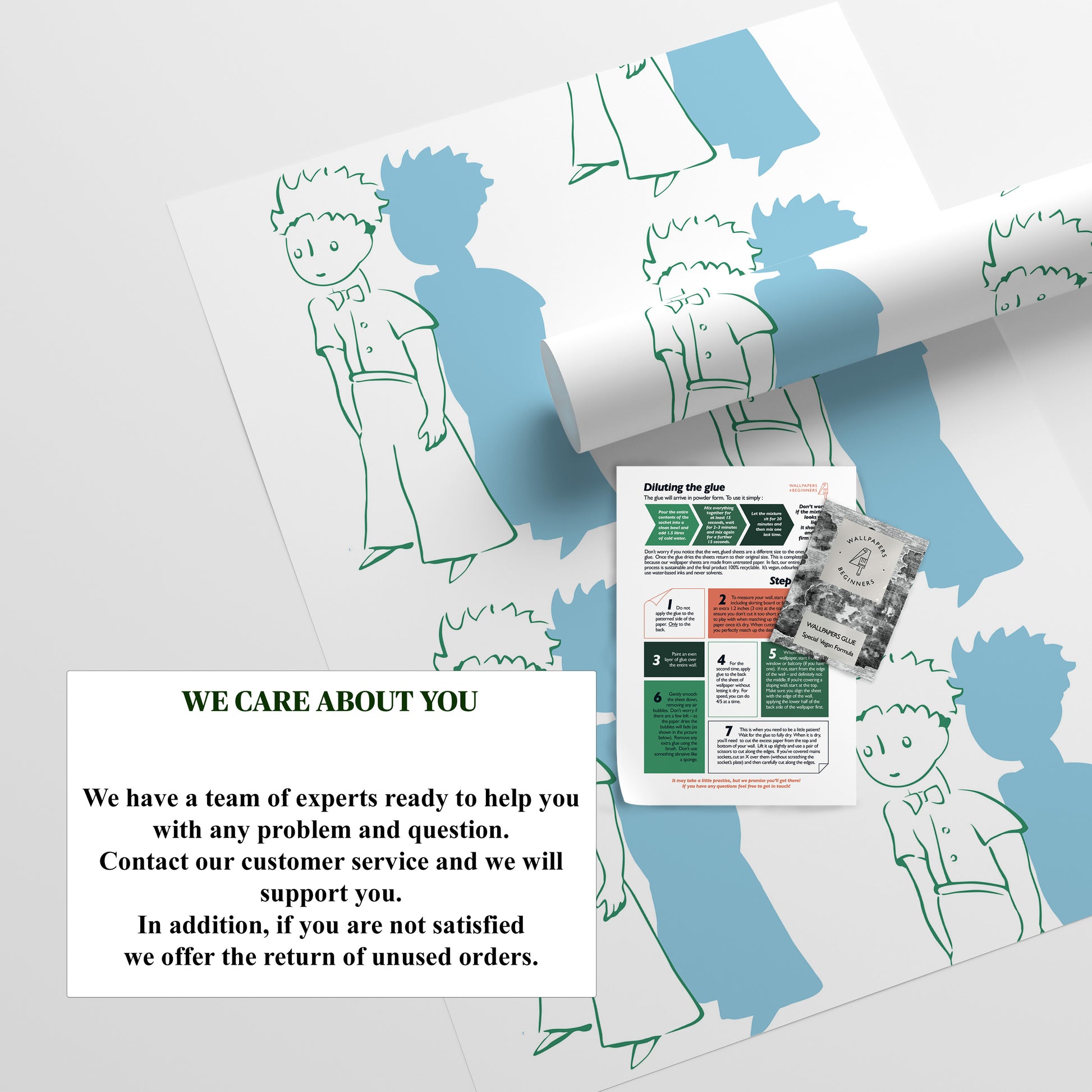 This elegant pattern features the beloved Little Prince alongside his own shadow, creating a poetic and minimalist silhouette effect. The green line art of the character contrasts beautifully with the soft sky-blue shadow, evoking both whimsy and reflection. Its simplicity makes it versatile, blending seamlessly into modern, minimalist, or vintage interiors.